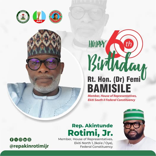 On behalf of the good people of Ekiti North 1 (Ikole/Oye) Federal Constituency, I warmly felicitate my brother, leader, and respected colleague, Rt. Hon. Femi Bamisile (BAFEM), Member representing Emure/Gbonyin/Ekiti East Federal Constituency, on the joyous occasion of his 60th birthday. I have had the privilege of knowing Rt. Hon. Bamisile for over 15 years. In that time, he has…