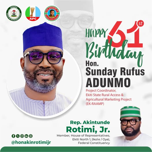 On this special occasion of your 61st birthday, I join countless others in celebrating Hon. Sunday Rufus Adunmo, Project Coordinator, Ekiti State Rural Access & Agricultural Marketing Project (EK-RAAMP). Your years of outstanding leadership, dedication, and unwavering service to the development of Ekiti State have been truly impactful. You are a shining example of integrity, professionalism, and deep commitment to…