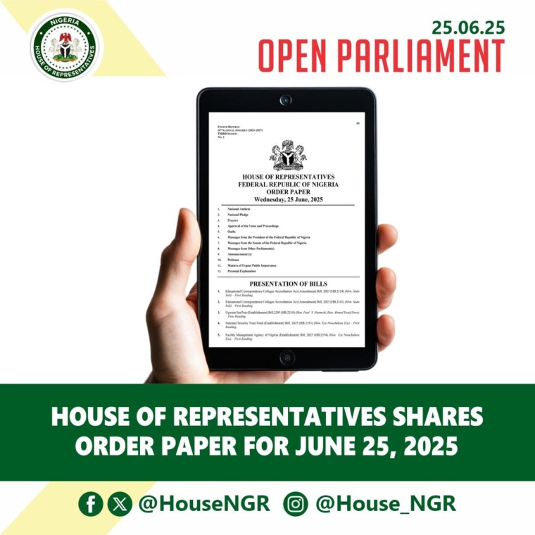 Abuja, FCT | Wednesday, June 25, 2025 – The House of Representatives is pleased to share the Order Paper for legislative proceedings at the Green Chamber this Wednesday, June 25, 2025, as issued by Rep. Francis Waive, Chairman of the House Committee on Rules and Business, in continuation of the Third Session of the 10th National Assembly. Today’s plenary includes…