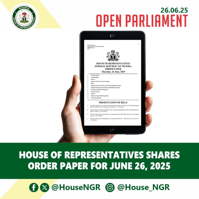 Abuja, FCT | Wednesday, June 25, 2025 – The House of Representatives is pleased to share the Order Paper for legislative proceedings at the Green Chamber this Wednesday, June 25, 2025, as issued by Rep. Francis Waive, Chairman of the House Committee on Rules and Business, in continuation of the Third Session of the 10th National Assembly. Today’s plenary includes…