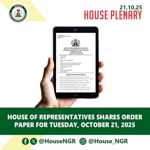 Abuja, FCT | Tuesday, October 21, 2025 – The House of Representatives has released the Order Paper for today’s plenary session, reaffirming its steadfast commitment to transparency, accountability, and open legislative governance. Today’s legislative sitting features a comprehensive agenda reflecting the House’s constitutional responsibilities of lawmaking, oversight, and representation. Key highlights include: 1. Presentation of Bills: Twenty-three bills are scheduled…