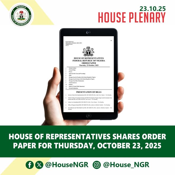 Abuja, FCT | Thursday, October 23, 2025 – The House of Representatives is pleased to announce the release of the Order Paper for today’s legislative sitting, reflecting a robust and diverse agenda that underscores the 10th House’s commitment to responsive, reform-driven, and people-centred lawmaking. Today’s plenary will open with regular proceedings, including prayers, petitions, and matters of urgent public importance,…