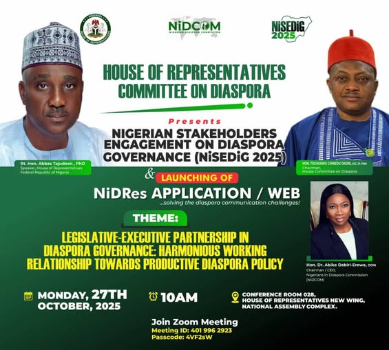 – NIDRes to address critical challenges in Diaspora communication, data management, and policy engagement Abuja, FCT | Saturday, October 25, 2025 – The House of Representatives through its Committee on Diaspora is set to host the Nigerian Stakeholders Engagement on Diaspora Governance (NiSEDiG 2025) in collaboration with the Nigerians in Diaspora Commission (NiDCOM). The event, themed “Legislative–Executive Partnership in Diaspora…