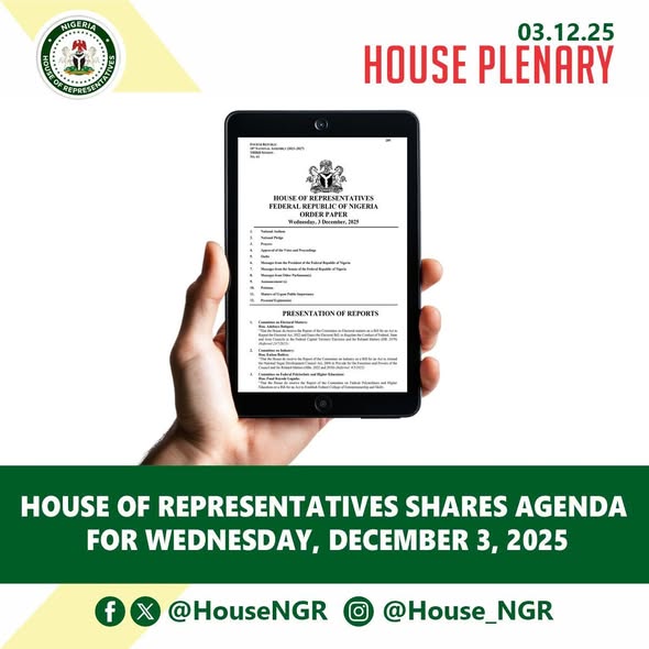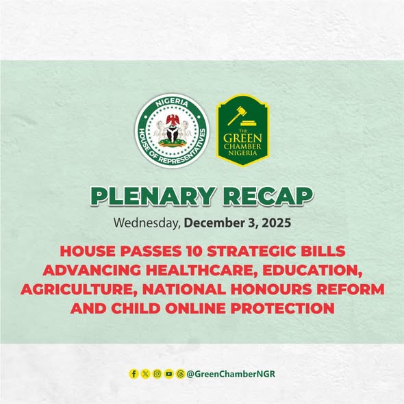 #PlenaryHighlights: Wednesday, December 3, 2025 The House at its plenary on Wednesday, December 3, 2025, passed ten strategic bills advancing Healthcare, Education, Agriculture, National Honours Reform, and Child Online Protection. The bills, presented by the House Leader, Rt. Hon. Julius Ihonvbere, CON, span five key reform areas as follows: 1. Child Protection and Digital Safety (i) A Bill for an…