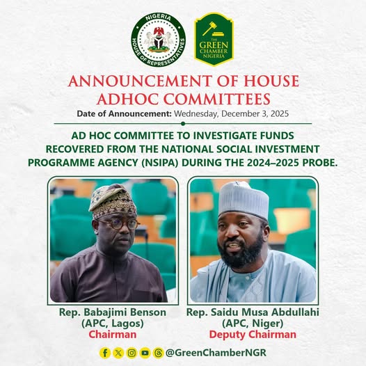 At its plenary on Wednesday, December 3, 2025, the House of Representatives constituted a new Ad Hoc Committee to investigate the total funds recovered from the National Social Investment Programme Agency (NSIPA) during the 2024–2025 investigations and to ascertain their current status and custodianship. The Committee is further mandated to identify all factors responsible for delays in releasing these funds…