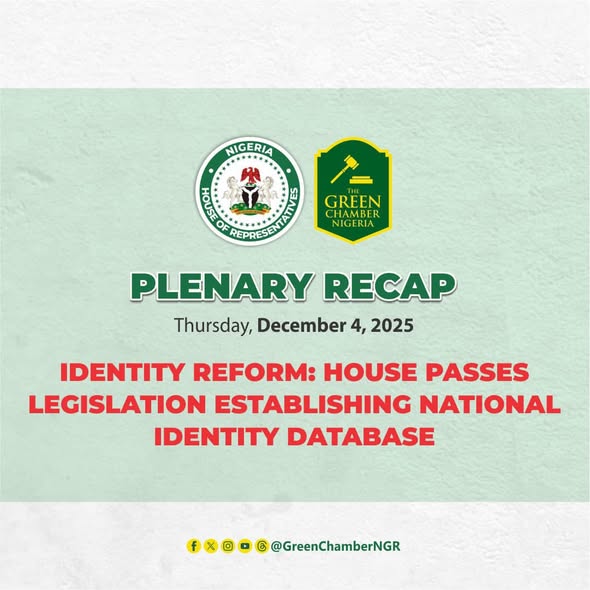 #PlenaryHighlights | Thursday, December 4, 2025 The House of Representatives has passed a major legislation advancing Nigeria’s identity management system. The bill, presented on the floor of the Green Chamber by the Deputy House Leader, Rep. Abdullahi Ibrahim Halims, repeals the National Identity Management Commission Act 2007 and establishes a strengthened National Identity Database and National Identity Management Commission. This…